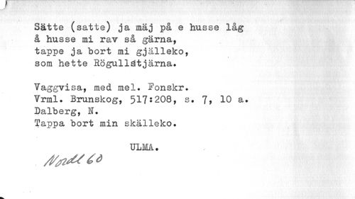 //// Sätte (satte) ja mäj på e husse låg å husse mi ra, v så gärna, tappe ja bort mi gjälleko, som hette Rögulldtjärna. //// Vaggvisa, med mel. Fonskr. //// Vrral. Brunskog, 517:208, s. 7, 10 a. //// Dalberg, N. //// TapDa bort min skälleko. //// • -i- «U //// ULMå. ////