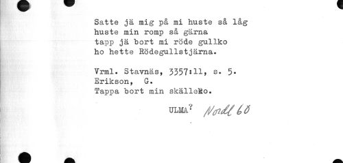 //// m m* ^ //// Satte jä mig på mi huste så låg huste min romp så gärna tapp jä "bort mi röde gullko ho hette Rödegullstjärna. //// Vrml. Stavnäs, 3357:11, s. 5* Erikson, G. //// Tappa "bort min skälloko. //// ULMA? /l/(fidi (>Ö ////