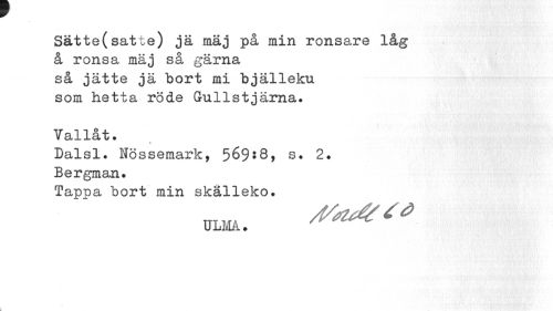 //// Sätte(satte) jä mäj på min ronsare låg å ronsa mäj så gärna så jätte jä bort mi bjälleku som hetta röde Gullstjärna. //// Vallåt. //// « //// Dalsl. Nössemark, 569*8, s. 2. Bergman. //// Tapt>a bort min skalleko. //// ULMA. ////