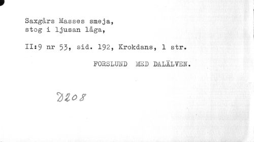//// Saxgårs Masses smeja, - //// stog i ljusan låga, //// 11:9 nr 53, sid. 192, Krokdans, 1 str. //// FORSLOTD MED DALÄLVEN. //// 2stos //// ; 1 ////