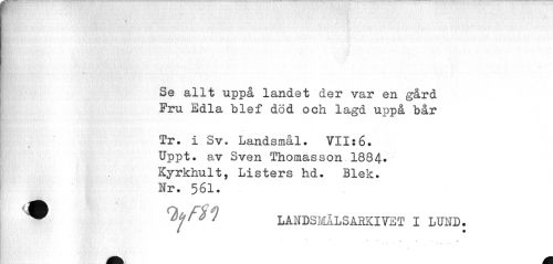 //// Se allt uppå landet der var en gård Pru Edla blef död och lagd uppå bår //// Tr. i Sv, Landsmål. VII:6. Uppt. av Sven Thomasson.1884* Kyrkhult, Listers hd. Blek. Nr. 561. //// htjFS*) LANDSMÅLSABKIVET I LUND • //// ! . ////