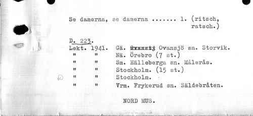 //// Se damerna, se damerna ... 1. (ritsch, //// ^jP^s ratsch.) //// D. 22j. //// ^ i h ~ Lekt. 1941. Gä. SxioLstg: Ovansjö sn. Storvik. //// " » Nä. Örebro (7 st.) //// " 11 Sm. Hälleberga sn. Målerås. //// " « Stockholm. (15 st.) fd " 11 Stockholm. - //// » " Vrm. Frykerud sn. Säldebråten. //// NORD MUS. //// ' T. ' //// 1 _ . - ^JÉJL.»__¦ . -___U_J___. . _ ---¦---— --——---——---* | ,. »II --- ////