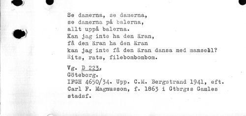 //// Se damerna, se damerna, se damerna på balerna, allt uppå balerna. I^Pl Kan jag inte ha den äran, //// få den äran ha den äran //// kan jag inte få den äran dansa med mamseil? Rits, rats, filebombombonw //// Vg. D 225,. //// Göteborg. //// IFGH 4650/34. Upp. C.M. Bergstrand 1941, eft. Carl F. Magnusson, f. I863 i Gtbrg:s Gamles stadsf. ////