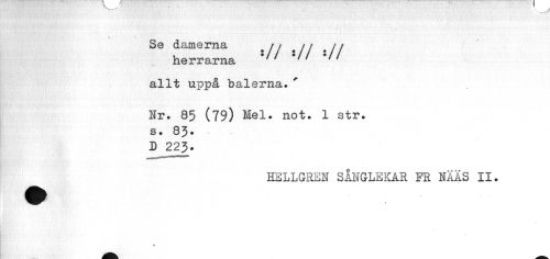 //// Se damerna * i t * 11 * i l herrarna //// allt uppå balerna.' //// Nr. 85 (79) Mel. not. 1 str. //// s. 83. D 223. //// HSLLGREN SÅNGLEKAR FR NAÅS II. //// 0 ////