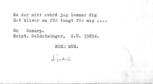 //// Se der mitt svärd jag lemnar dig Det bliver nu för tungt för mig ... //// Sk Genarp. //// Mskpt. Soldatsånger, E.U. 33é54« //// HORD MUS. //// J tA-A-O ////