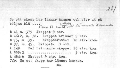 //// n/ //// I //// Se ett skepp har lämnar hamnen och styr ut på böljan blå .. A ^ — //// B 41 s. 379 Skeppet 9 str. B 46:2, s. 38» Skeppet brinner 9 str. B 75, s 39. Skeppsbrottet 18 str. kom. B 97, s. 45. Skeppet. 8 st i?. A 149 Döt brinnande skeppet 10 str. kom. //// A 358:2 ...9 str. kom. //// A 484*6 Skeppet 9 str. kom. //// Jfr. Nu ett skepp har lämnat hamnen. //// RA. ////