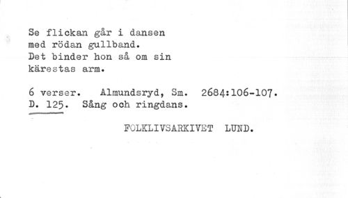 //// Se flickan går i dansen med rödan gullband. Det binder hon så om sin kärestas arm. //// 6 verser. Almundsryd, Sm. 2684*106-107* D. 125. Sång och ringdans. //// FOLKLIVSARKIVET LUUD. //// > ////