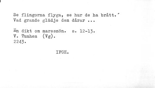 //// Se flingorna flyga, se hur de ha brått. ' Vad grande glädje dem dårar ... //// En dikt om marssnön, s. 12-13. V. Tunhem .(7g). //// 2243. //// ifgh. ////