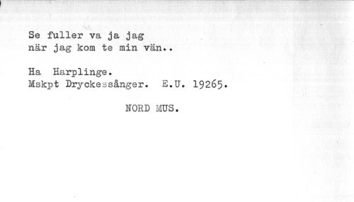 //// « //// Se fuller va ja jag när jag kom te min vän». //// Ha Harplinge. //// Mskpt Dryckessånger. E.U. 19265. //// NOHD MUS. ////