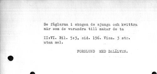 //// Se fåglarna i skogen de sjunga och kvittra när som de varandra till makar de ta //// II:VI. Bil. 5:3, sid. 196. Visa. 3 str. utan mel. //// FORSLUUD MEL DALÅLYSH. //// • 4" • *" 1 . ////