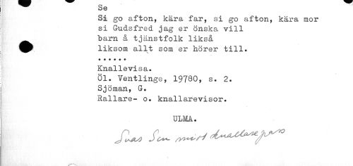 //// oe //// Si go afton, kära far, si go afton, kära mor si Gudsfred jag er önska vill //// •barn å tjänstfolk likså liksom allt söm er hörer till. //// Knallevisa. //// Öl. Ventlinge, 19780, s. 2. Sjöman, G. //// Rallare- o. knallarevisor. //// ULMÅ. //// \ ////