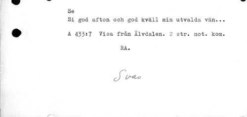 //// Se //// Si god afton och god kväll min utvalda vän... A 433:7 Visa från Älvdalen. 2 str. not. kom. //// HA. //// (JU-iVq //// "v ////