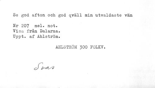 //// Se god afton och god qväll min utvaldaste vän //// Nr 207 mel. not. Visa från Dalarna. Uppt. af Åhlström. //// ÅHLSTRÖM 300 FOLKV. //// d l^*isv //// % ////