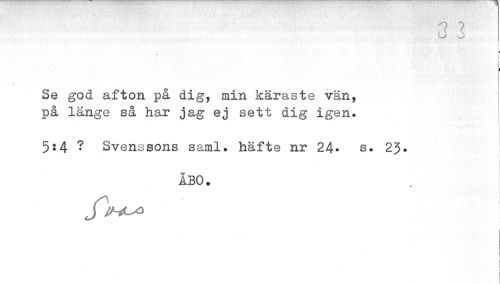 //// 33 //// i //// P //// * % //// i //// Se god afton på dig, min käraste vän, på länge så har jag ej sett dig igen. //// I //// 5:4 ? Svenssons saml. häfte nr 24* 23. //// * 1 //// ÅBO. //// jOm^J //// j I //// 1 //// 1 //// 1 //// j ////