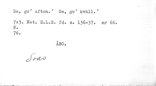 //// I //// Se, go' afton.' Se, go' kväll.' //// 7:3. Ket. S.L.S. 24. s. 136-37. nr 66. //// n. //// 76. //// ÅBO. //// J^tVO ////