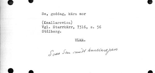 //// Se, goddag, kära mor //// (Knallarevisa) //// Vgl. Starrkärr, 7316, s. 56 //// Stålberg. //// ULMA • ////