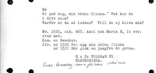 //// Se //// Si god dag, min täcka flicka»' Yad har du i ditt sinn? //// Varför är du så ledsen? Vill du ej bliva min? //// Nr. 1521, sid. 667. Axel och Maria B, 10 str. //// utan mel. //// Kom. av Dencker. //// Jfr. nr 1520 Goddag^ min sköna flicka //// nr 1522 Där gick en jungfru åt gröna. //// H o E: F0LKM;N FR •£ KLÄCKEBARGA. . c ////