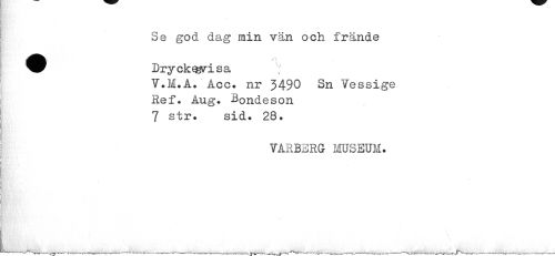 //// Se god dag min vän och frände //// • A //// Dryck&risa \J //// V.M.A. Acc. nr 3490 Sn Vessige //// Ref. Aug. Bondeson //// 7 str. sid. 28. //// VAKBERG MUSEUM. ////