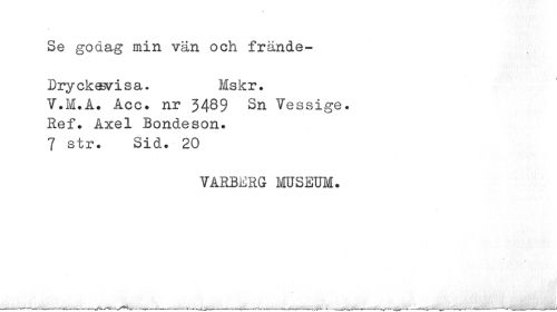 //// Se godag min vän och frände- //// Dryckesvisa. Mskr. //// Y.M.A. Acc. nr 3489 Sn Yessige. Ref. Axel Bondeson. 7 str. Sid. 20 //// VARBERG MUSEUM. ////