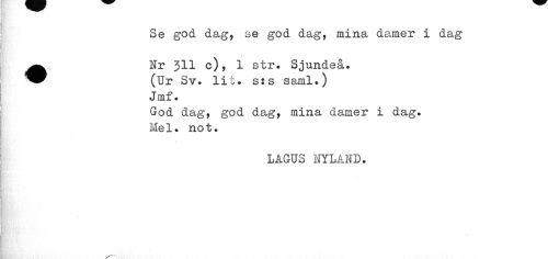 //// Se god dag, se god dag, mina damer i dag, //// •Nr 311 c)> 1 str. Sjundeå. (Ur Sv. lit. s:s saml.) Jmf. //// God dag, god dag, mina damer i dag. Mel. not. //// LAGUS NYLAND. //// ¦ ////