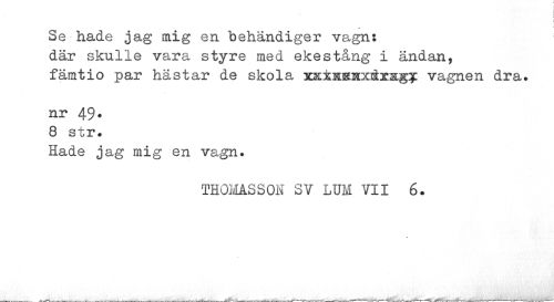 //// I I //// i //// i //// Se hade jag mig en behändiger vagn: //// där skulle vara styre med ekestång i ändan, //// fämtio par hästar de skola xxtMKKxiärsgy vagnen dra. //// nr 49* 8 str. //// Hade jag mig en vagn. //// THOMASSON SY LUM VII 6. ////