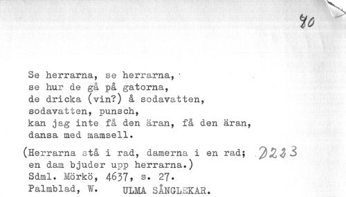 //// "V //// %0 //// Se herrarna, se herrarna,• se hur de gå på gatorna, de dricka (vin?) å sodavatten, sodavatten, punsch, //// kan jag inte få den äran, få den äran, dansa med mamsell. //// (Herrarna stå i rad, damerna i en rad; en dam bjuder upp herrarna.) //// Sdml. Mörkö, 4637, s. 27• Palmblad, W. ULMA SÅNGLEKAR. ////