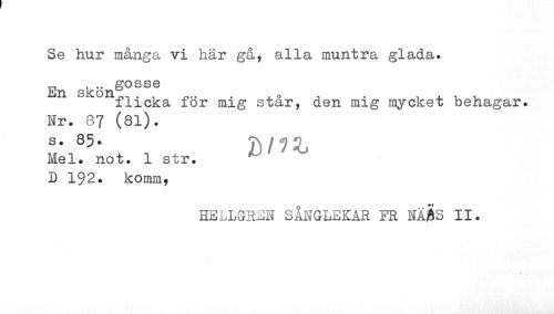 //// Se hur många vi här gå, alla muntra glada. //// g gosse //// flicka för mig står, den mig mycket behagar. //// Nr. 37 (81). //// s. 85. Dnz //// Mel. not. 1 str. I) 192. komm, //// HELLGREH SÅNGLEKAR FR NÄflS II. ////