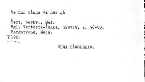//// Se hur många vi här gå //// + + //// Text, beskr., Mel. //// Ygl. Vartofta-Åsaka, 3247*9» 56-58. | //// Bergstrand, Maja. j //// 7>192. //// i //// ULMA SÅNGLEKAR. i //// t- //// I //// a ////