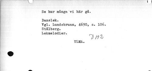 //// Se hur många vi här gå. Danslek. //// ?gl. Lundsbrunn, 4^90, s. 106. //// Stålberg. //// Lekmelodier. //// 7 //// ULMA. //// t ////