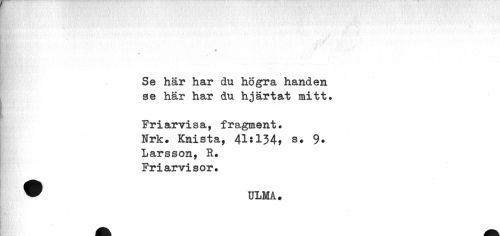 //// MVfj n •" • 'i ^ li //// v //// Se här har du högra handen se här har du hjärtat mitt. //// Friarvisa, fragment. Nrk. Knista, 415 154, s# 9. Larsson, R. Friarvisor. //// ® ULMA* ////