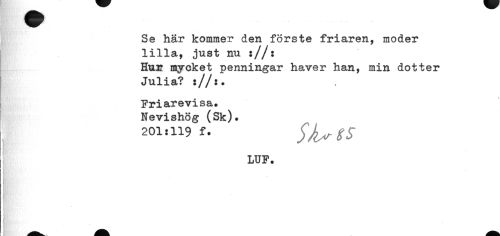 //// Se här kommer den förste friaren, moder lilla, just nu ://: //// Hur mycket penningar haver han, min dotter Julia? ://:. //// Friarevisa» //// Nevishög (Sk). //// 201:119 f. $)l*rtS //// LUF* ////