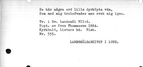 //// Se här några ord lilla dyrköpta vän, Som med mig trolofvades men svek mig igen. //// Tr. i Sv. Landsmål VII:6. Uppt. av Sven Thomasson 1884» Kyrkhult, Listers hd. Blek. Nr. 555. //// LANDSMÅLSARKIVET I LUND. ////