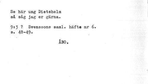 //// Se här ung Dietshelia så såg jag er gärna. //// 9:3 ? Svenssons saml. häfte nr 6. s. 48-49. //// ÅBO. //// V ////