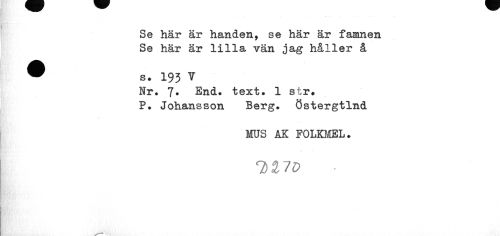 //// Se här är handen, se här är famnen Se här är lilla vän jag håller å //// ® s. 193 V //// Nr. 7. End. text. 1 str. P. Johansson Berg. Östergtlnd //// MUS AK FOLKMEL. ////