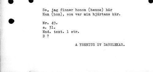 //// Se, jag finner honom (henne) här Han (hon), som var min hjärtans kär. //// ® Kr. 49. //// s. 31* //// Bnd. text. 1 str. D ? //// A YSENIUS S? DÅNSLEKAR. ////