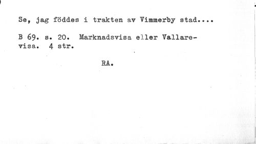 //// Se, jag föddes i trakten av Vimmerby stad...» j //// B 69* s# 20. Marknadsvisa eller Vallarevisa. 4 str. //// < //// v //// HA. //// i j //// I i 1 //// I ////