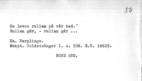 //// si) //// Se leves rullan på vår hed. * Rullan går, - rullan går ... //// \ //// l > //// i //// Ha. Harplinge. //// Mskpt. Soldatsånger I. s. 508. E.U. 18629- //// NORD MUS. //// _ //// i //// t //// i i //// i //// ! ¦ ////