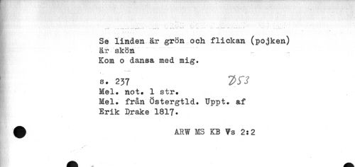//// t I //// - ••• • . » --- ... ! :•• «t...:< .-• • • • ¦ I- ¦¦*¦¦ - — * '¦— ...- ...* ¦• •¦•¦ • •¦ - //// Se linden är grön och flickan (pojken) är skön //// Kom o dansa med mig. //// s. 237 7>f3 //// Mel» not» 1 str» //// Mel. från Östergtld» Uppt» af //// Erik Drake 1817» //// 0 ARW MS KB Vs 2:2 ////