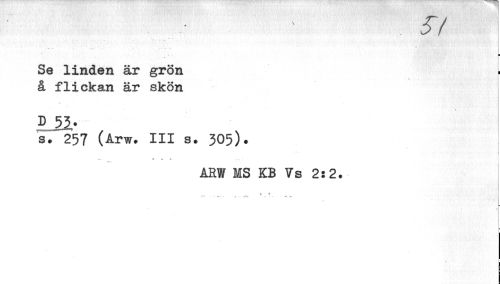 //// 57 //// ¦ //// Se linden är grön //// å flickan är skön //// \ //// D52/ //// s. 257 (Arw. III s. 505)» //// ... V U T //// ARW MS KB Vs 2:2. //// i //// t •> //// ¦1 ////