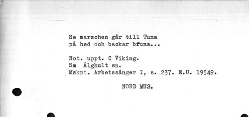 //// Se marschen går till Tuna på hed och backar bfuna.*• //// Not. uppt. C Viking. Sm Älghult sn. //// Mskpt. Arbetssånger I, s. 257* E#U. 19549» //// NORD MUS. ////