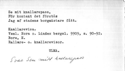 //// Se mit knallarepass, //// För kontant det förstås //// Jag af stadens borgmästare fått. //// i //// i //// Knallarevisa. //// > i TTsml. Hora o. Lindes bergsl. 9909* s. 90-92. //// Bore, E. //// Hållare- o. knallarevisor. //// i //// i //// ULM. //// f^uc fe*. //// : i' ': , I //// I ////