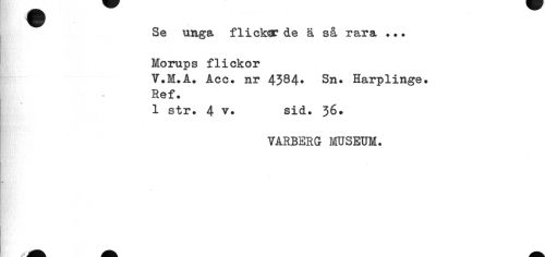 //// Se unga flickor de ä så rara . . . Morups flickor //// V.M.A» Acc. nr 4384* Sn. Harplinge. Ref» //// 1 str. 4 v. sid. 36» //// VARBERG MUSEUM. ////