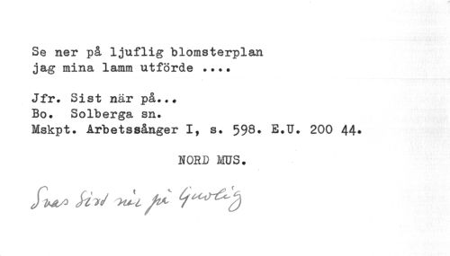 //// Se ner på ljuflig blomsterplan jag mina lamm utförde ... //// Jfr. Sist när på... Bo. Solberga sn. //// Mskpt. Arbetssånger I, s. 598. E.U. 200 44- //// NORD MUS. //// <hU /vi f ^^ ////