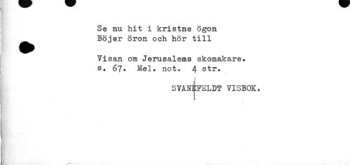 //// Se nu hit i kristne ögon ^^ Böjer öron och hör till //// Visan om Jerusalems skomakare. //// s. 67» Mel. not. 4 str. //// J //// SVANAFELDT YISBOK. //// 4 ////