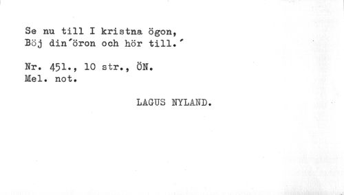 //// Se nu till I kristna ögon, Böj din'öron och hör till. ' //// Nr. 451.f 10 str., ÖN. Mel. not. //// lagus nyland. ////