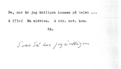 //// Se, nur är jag äntligen kommen på balen //// t //// A 273:2 En nidvisa. 4 str. not. kom. //// RA. //// f^ S«f ^^^ ////