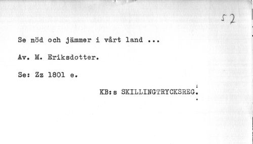 //// ¦ //// o //// f fl //// Se nöd och jämmer i vårt land ••• //// l //// Av» M. Eriksdotter. Se: Zz 1801 e. //// K t //// I //// KBss SKILLINGTEYCKSREG! //// - ////