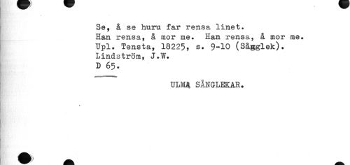 //// I //// Se, å se huru far rensa linet. Han rensa, å mor me. Han rensa, å mor me. Upl. Tensta, 18225, b. 9-10 (Sågglek). Lindström, j.w. //// D 65. //// ulmä, sånglekar. //// M AN» ¦ ¦ ////