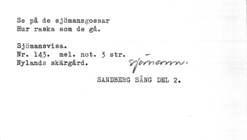 //// I //// Se på de sjömansgossar Hur raska som de gå. //// Sjömansvisa. //// Fr. 143» mel. not. 3 str. //// Nylands skärgård. > //// SANDBERG SÅNG DEL 2. //// » ////