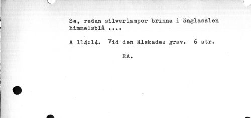 //// Se, redan silverlampor brinna i änglasalen //// himmelsblå •••• //// * //// A 114:14« ^id den älskades grav. 6 str. //// RA. ////